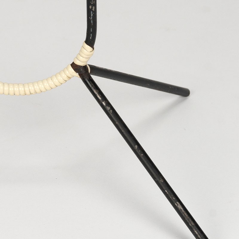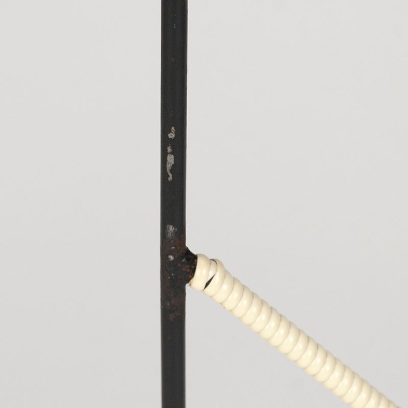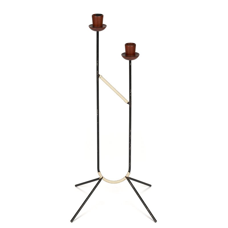 Floor model candleholder from the fifties / sixties, Denmark. Special model with teak holders and a metal frame wrapped with cream-colored wire. The condition is fair, one of the teak holders is no longer 100% neat, the frame has some paint damage, see details. The dimensions are 68.5 cm high, the width is approximately 17 cm (measured at the top).