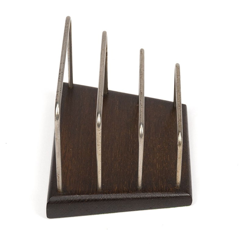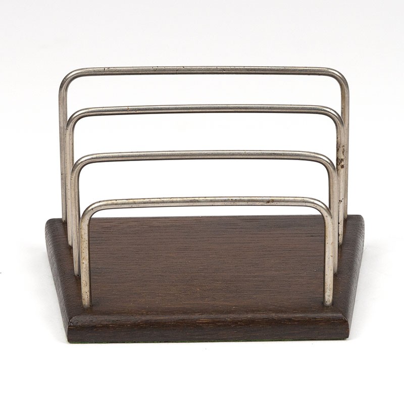 Letter holder from the sixties. The vintage letter holder has a dark base and chrome colored brackets. The condition is good considering the age, see details. The dimensions are 15 cm wide, 10.5 cm deep and 9.5 cm high.