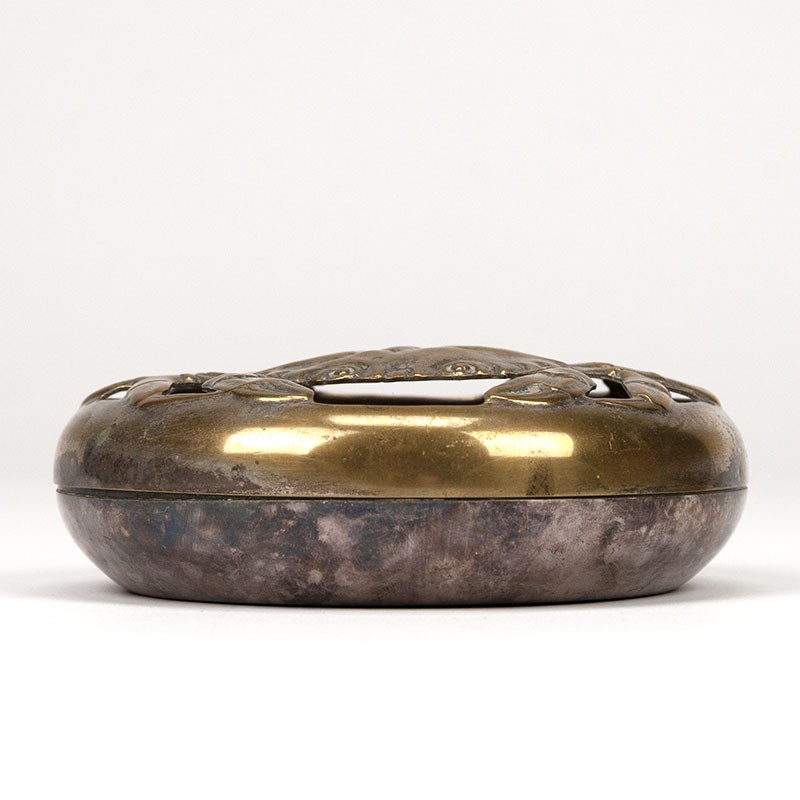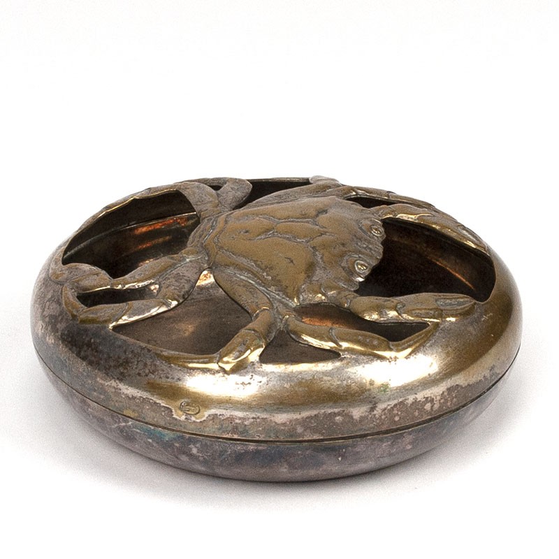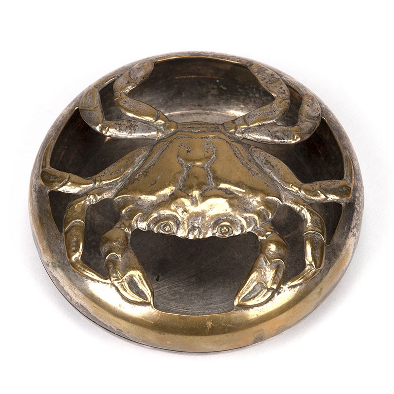 Vintage ashtray from the forties/fifties. The ashtray has a decorative crab at the top. The ashtray is made of 'silver plated' metal, the color is between silver and brass. The condition is reasonable, there are clear traces of use visible. The dimensions are 13 cm in diameter and 4 cm high.