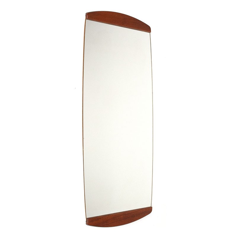 Mirror from the sixties. The vintage mirror is oval in shape and has a teak edge at the top and bottom. The condition is good, minimal traces of use, see details. The dimensions are 35.5 cm wide and 78 cm high.