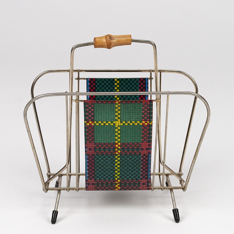 Vintage letter holder from the sixties. Nice model with tartan (synthetic) and brass-colored metal. The condition is good, see details. The dimensions are 15 cm wide, 7.5 cm deep and 15 cm high.