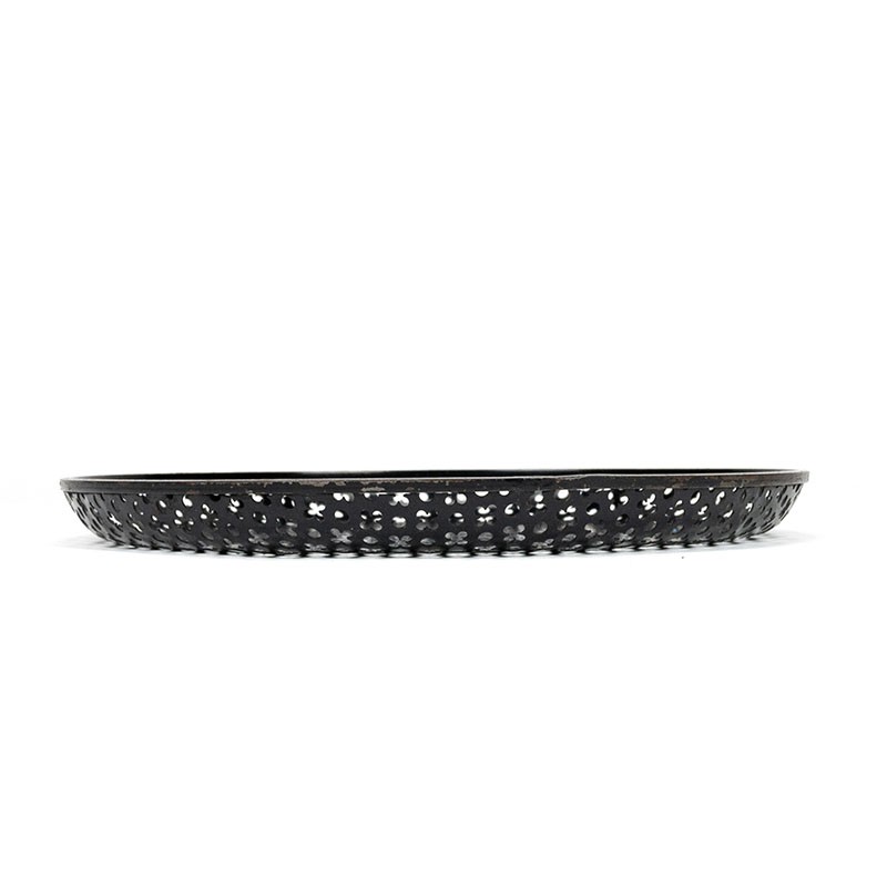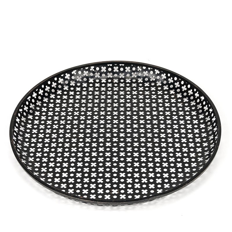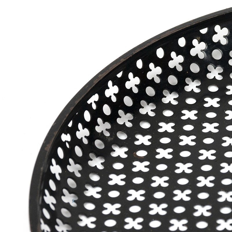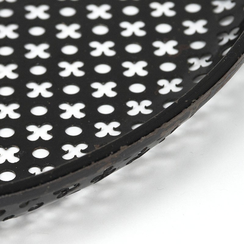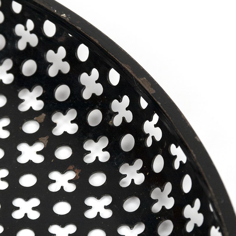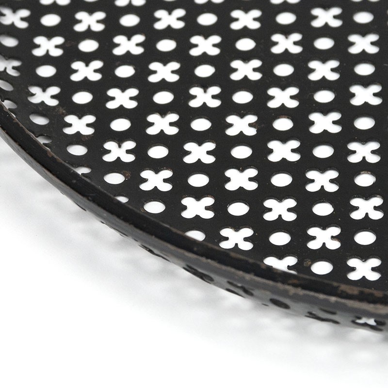 Black perforated metal plateau. The vintage bowl comes from the fifties. The design is very similar to Mathieu Mategot. The condition is reasonable given the age, some light signs of wear, see details. The dimensions are 32.5 cm in diameter and 2.8 cm high.