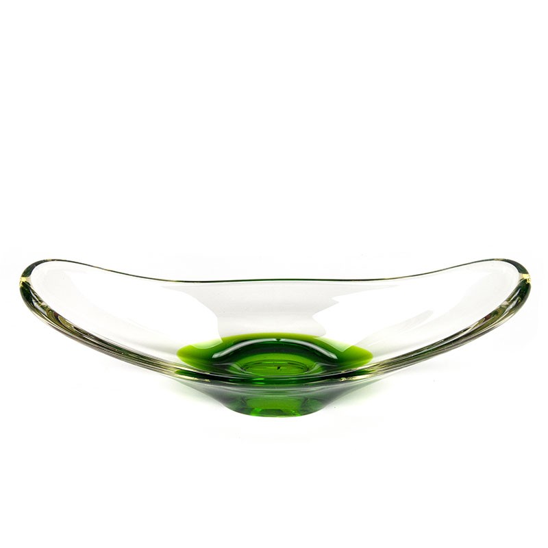 Glass vintage bowl from Scandinavia. Beautiful model with a green base that changes into clear glass. The condition is good, no snips, see details. The dimensions are 32 cm long, 9.7 cm wide and 10.5 cm high.
