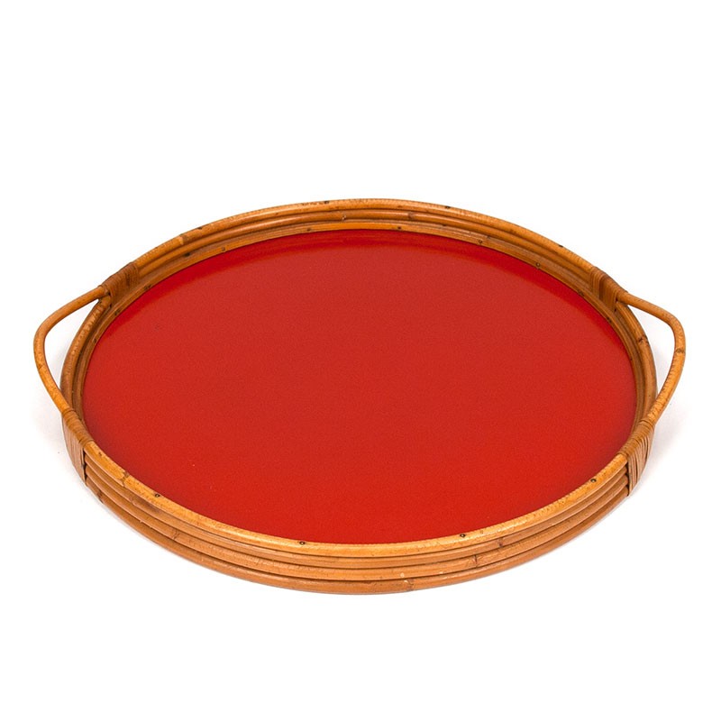 Mid-Century tray with red interior and bamboo edge. Originating from the period 1950-1960. The condition is good, especially considering the age, see details. The dimensions are 36 cm in diameter and 5 cm high.