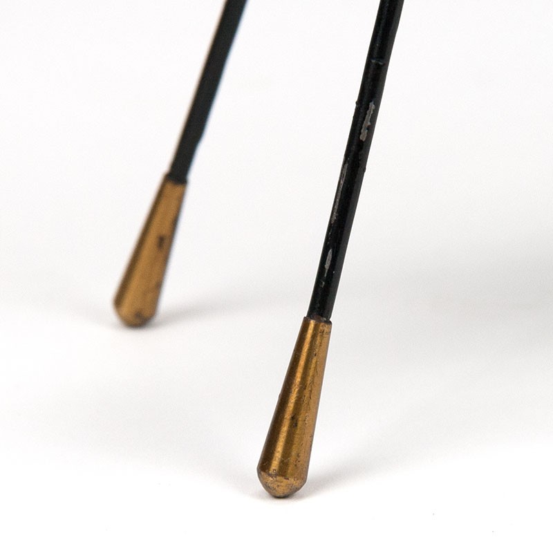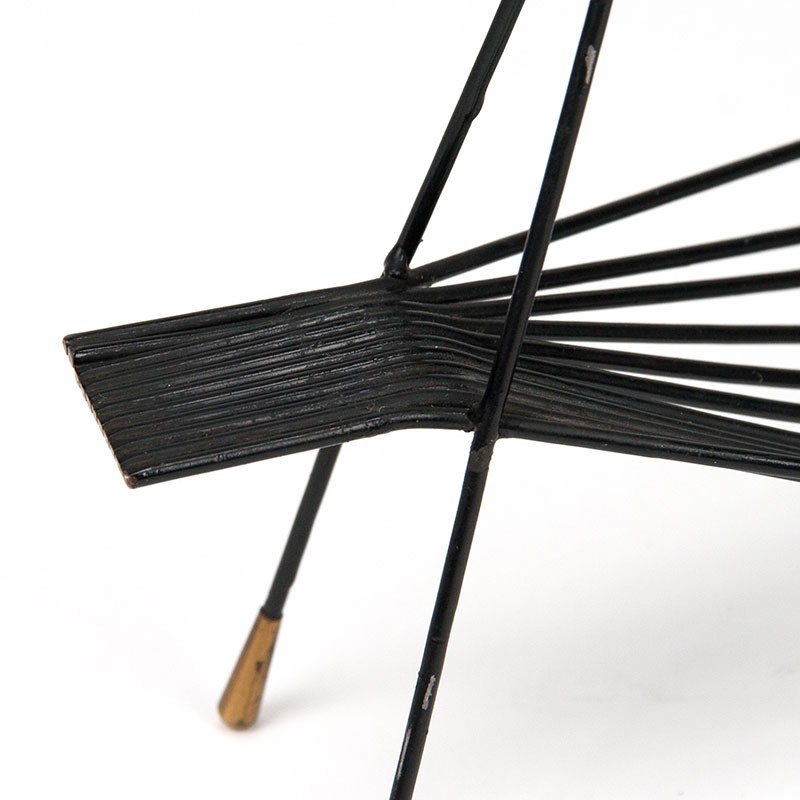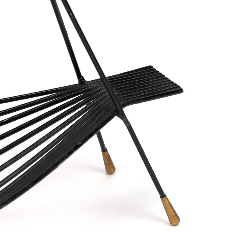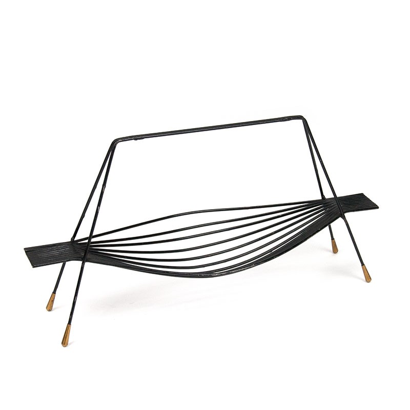 Fifties fruit bowl made of wire metal. The color is black with brass colored legs. Slim design. The condition is good, only minimal signs of wear commensurate with the age, see details. The dimensions are 38.5 cm long, 12 cm wide and 19.5 cm high.