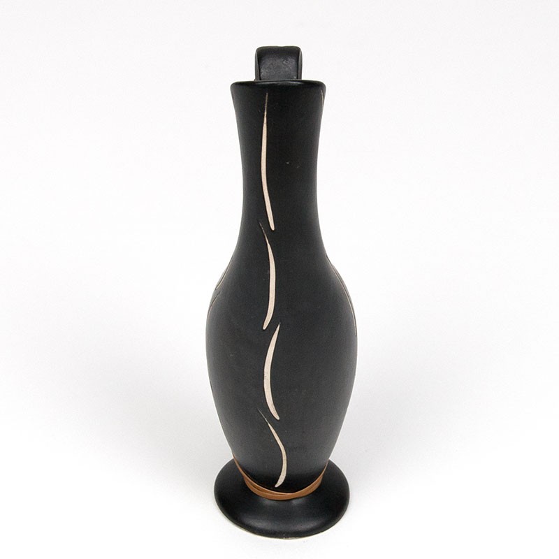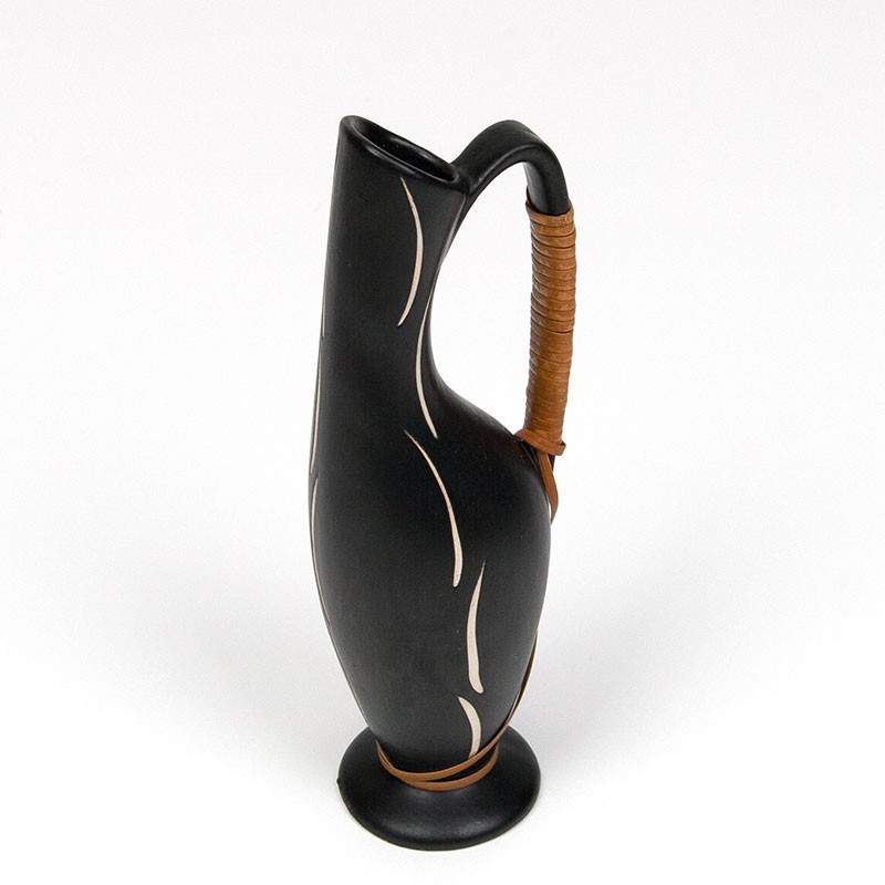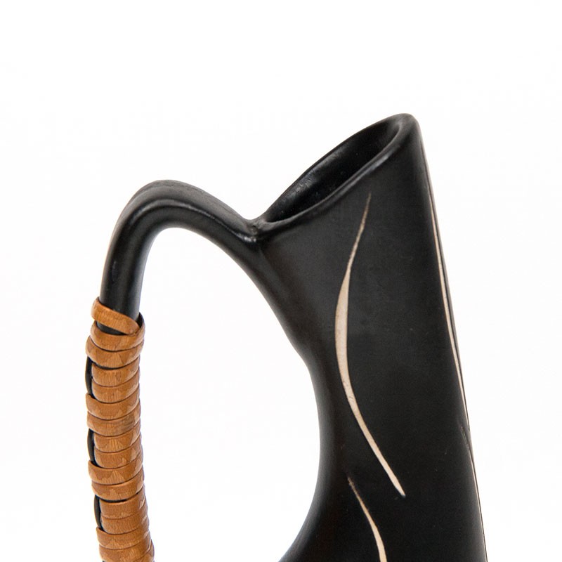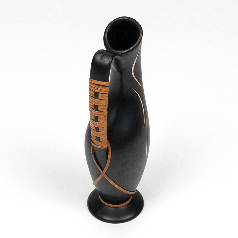 Ceramic vase, small model, from the fifties in Denmark. Beautiful stylish vintage piece. Slim design with wicker detail. The condition is good, undamaged, see details. The dimensions are 6.5 cm wide, 5 cm in diameter and 19 cm high.