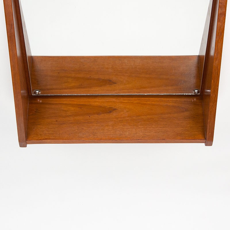 Wall mirror from the mid sixties, Denmark. Special model, sleek design, with a shelf. The condition is good considering the age, a small restoration is visible at the bottom left corner, see details. The dimensions are 49.5 cm wide, 66 cm high and 16.5 cm deep.