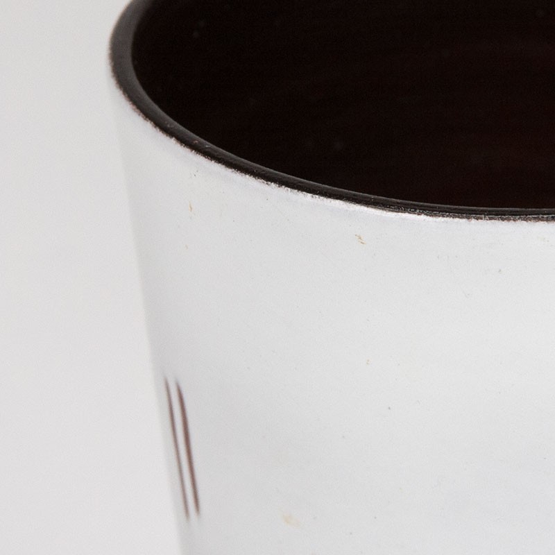 Vintage vase from the sixties. White glazed exterior with small detail. The condition is good, undamaged, see details. The dimensions are 17 cm high and 10.5 cm in diameter.