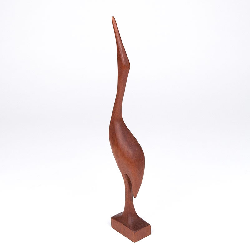 Teak wooden statue of a crane, designed by Arne Basse (marked). Beautifully designed model. The condition is good, undamaged, see details. The dimensions are 46 cm high, 8 cm wide and 5 cm deep.