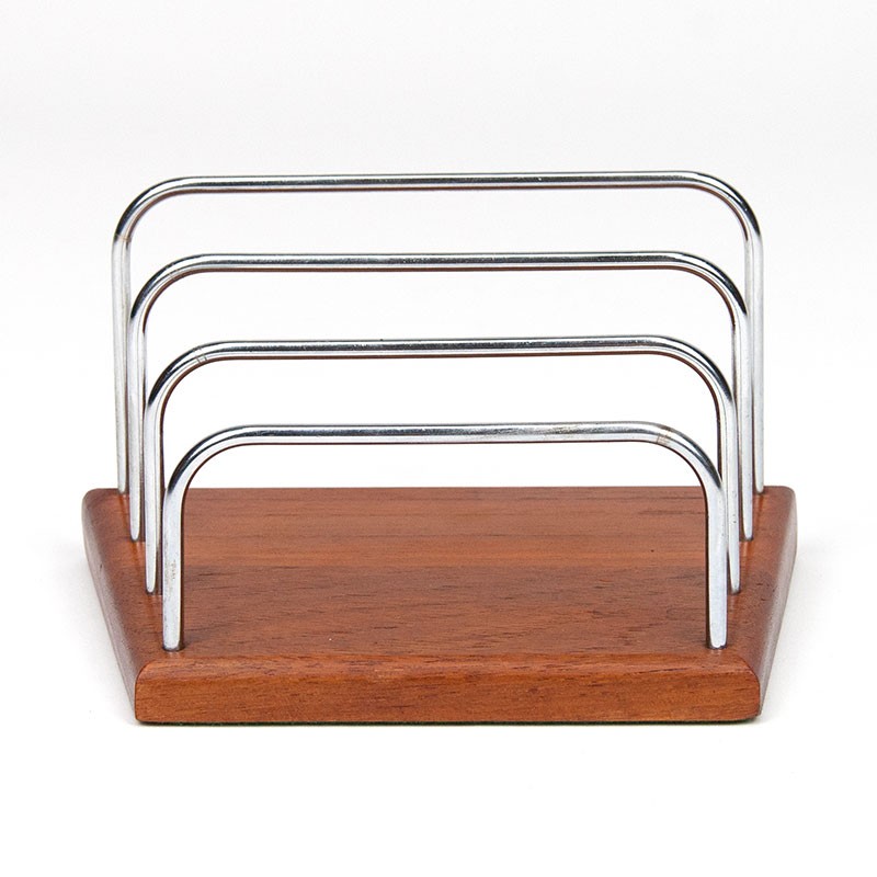 Post stand/letter holder from Denmark. Beautiful vintage model with teak base and chrome brackets. The condition is good, see details. The dimensions are 15 cm wide, 10 cm deep and 8.5 cm high.