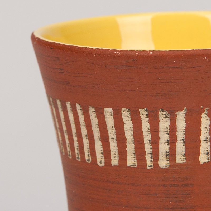 High model vase of ceramic from the sixties. Nicely decorated on the outside and a yellow inside. The vintage vase is marked on the bottom. The condition is good, undamaged, see details. The dimensions are 12 cm in diameter and 25.5 cm high.
