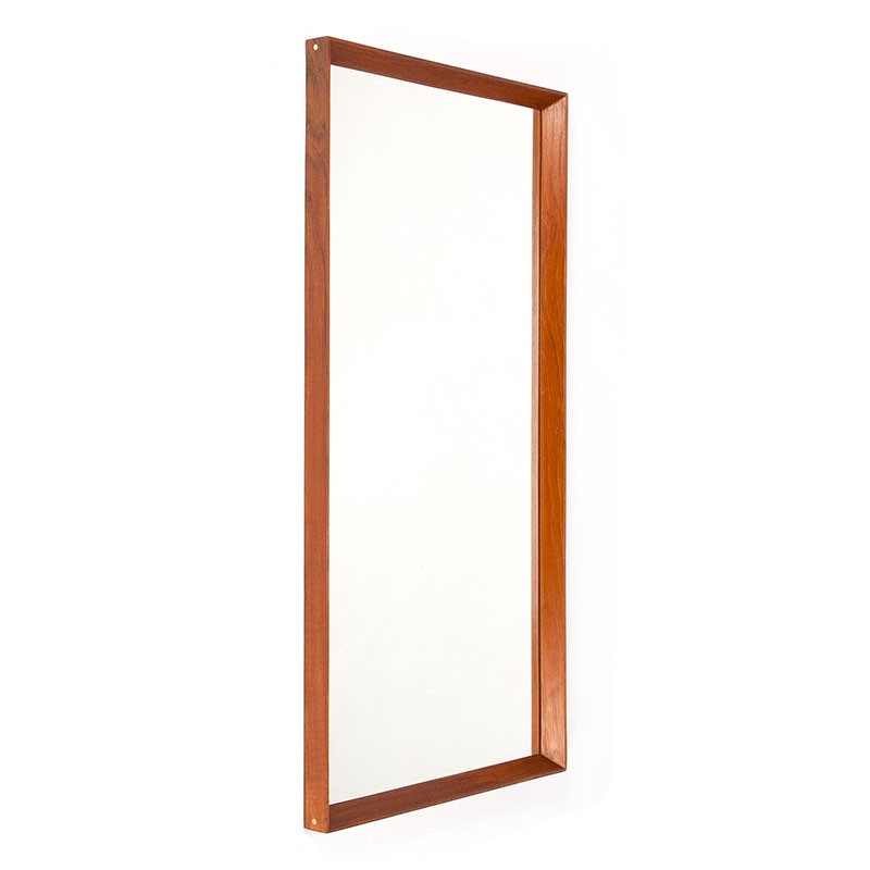 Vintage mirror from Denmark, period 1960-1969. Beautiful Mid-Century model, made of teak. The mirror has a small brass detail on the corners. The condition is good considering the age, see details. The dimensions are 41 cm wide, 3.5 cm deep and 81 cm high.