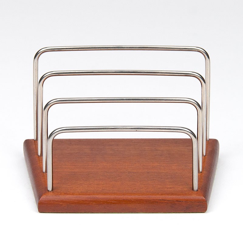 Letter holder/stand from Denmark. Beautiful vintage model with a teak base and chrome brackets. The condition is good, see details. The dimensions are 15.5 cm wide, 11 cm deep, and 9.5 cm high.