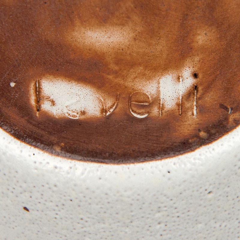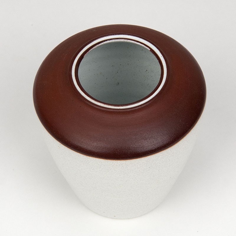 Vintage vase from the Dutch ceramic brand Ravelli. Beautiful model with a white base and brown top. Marked. The condition is good and undamaged, see details. The dimensions are 10.5 cm in diameter and 11.5 cm high.