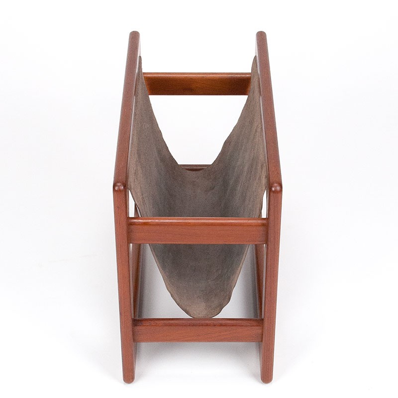 Vintage newspaper rack from the mid-1960s. Originating from the Salin Møbler furniture factory. Beautiful design with a high-quality solid teak frame and leather magazine rack. The condition is good, with very minimal signs of wear. The dimensions are 52 cm long, 25 cm wide, and 40 cm high.