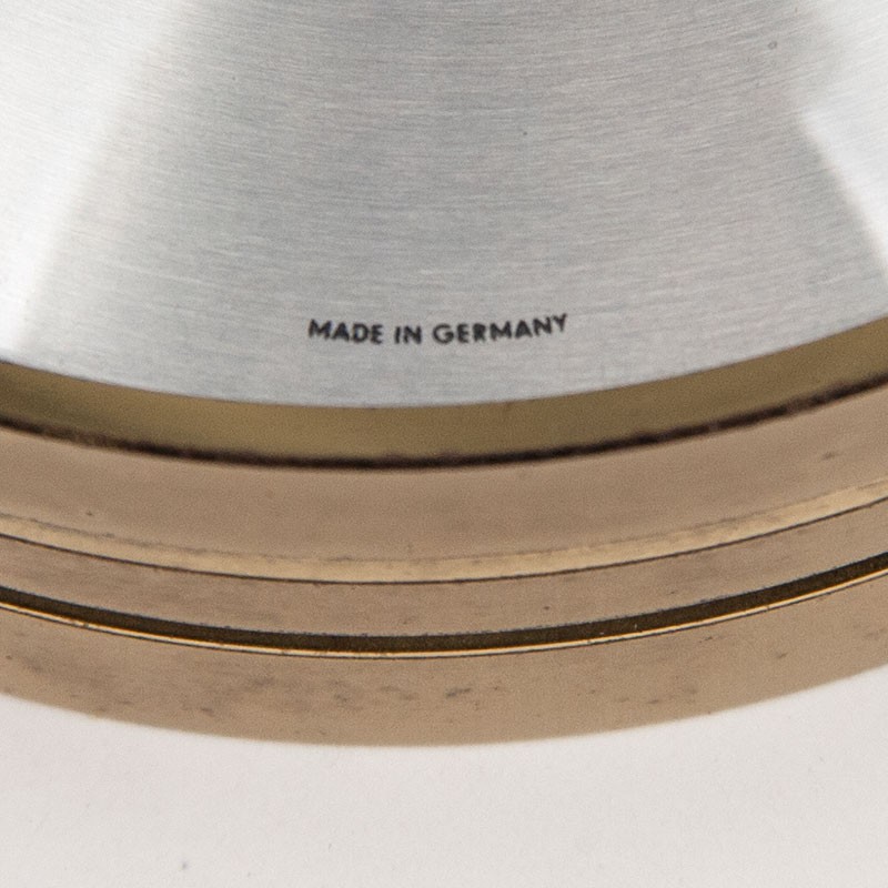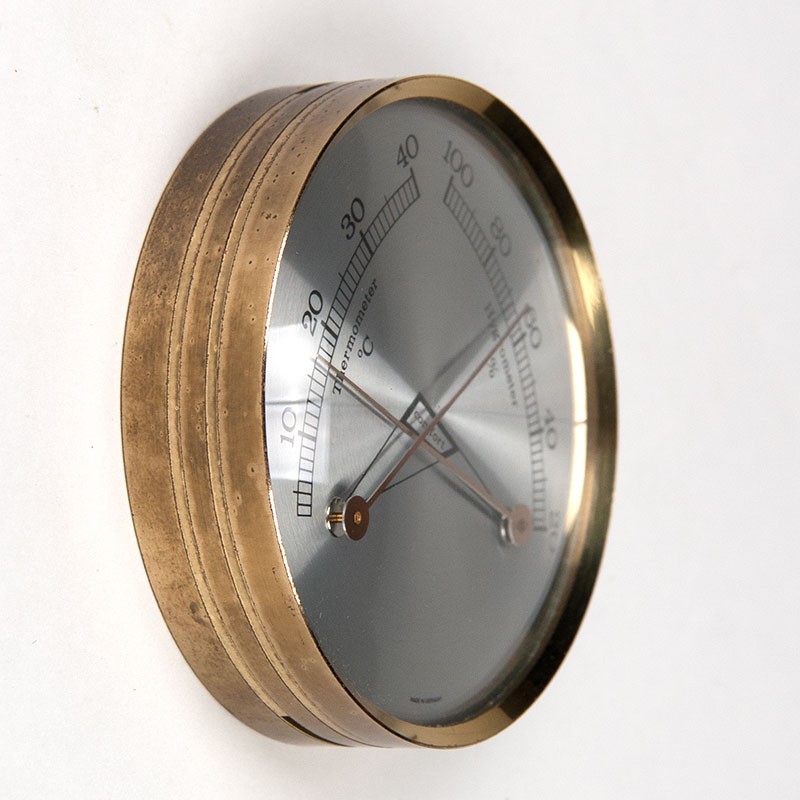 Vintage small wall thermometer and hygrometer. Made with a brass casing and brass hands, glass front. In good condition, see details. Dimensions: 8.5 cm in diameter and 2.2 cm deep.