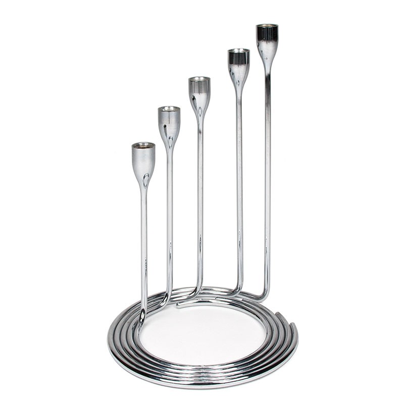 Set of designer candlesticks from the early 1970s. A unique vintage set, crafted from chrome-plated metal. The set consists of five separate pieces that together form a cohesive whole. The condition is good, see details. The dimensions are a maximum of 35.5 cm high and a minimum of 22 cm high, and the diameter is a maximum of 23.5 cm and a minimum of 17 cm.