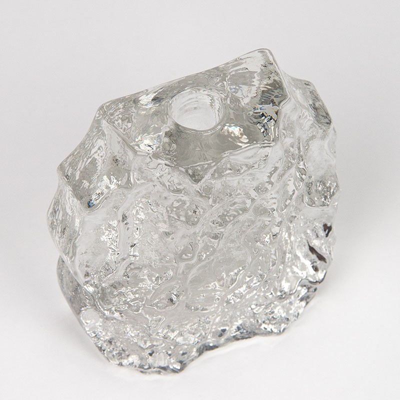 Clear glass solofleur, shaped like an ice block, from Georgshütte, Germany. Vintage piece from 1965-1969. It is in good, undamaged condition; see details. It measures 9 cm wide, 4 cm deep, and 10 cm high.