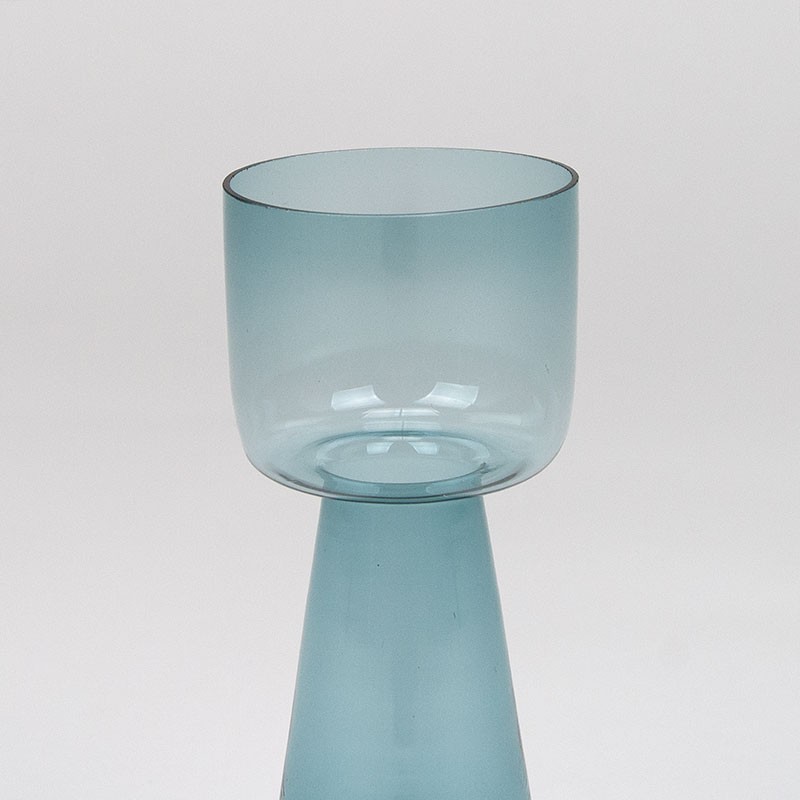 Blue glass vase, officially designed as a hyacinth vase, from the 1950s. A sleek vintage design, made of thin glass. The vase is undamaged, see details. It measures 7 cm in diameter and 20 cm high.