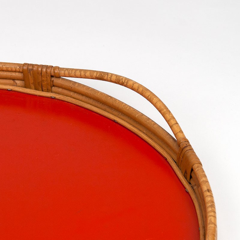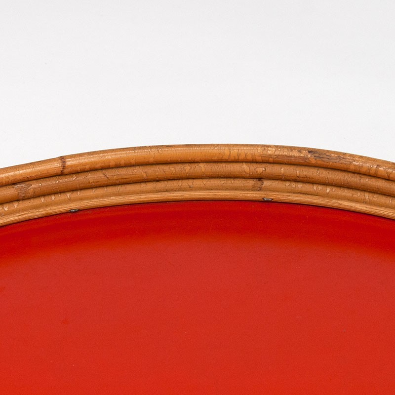 Large vintage bamboo tray with a red interior. Dating from the 1950s-1960s. The condition is good, especially considering its age; see details. The dimensions are 43 cm in diameter and 3.5 cm high.