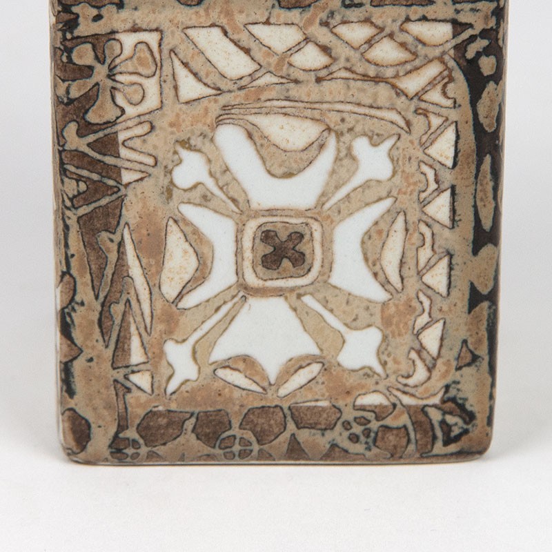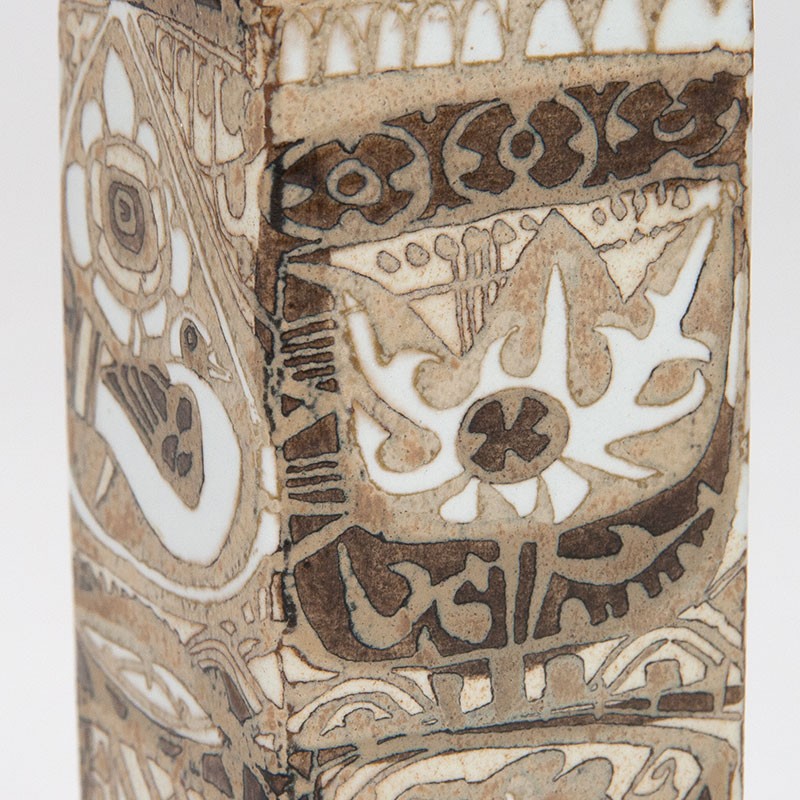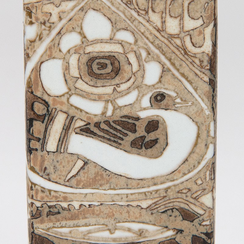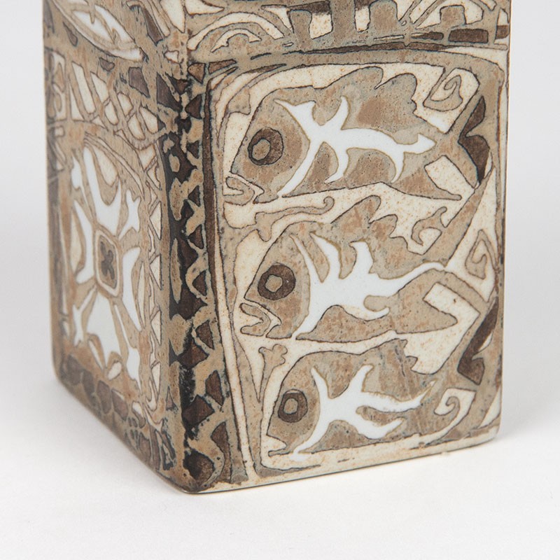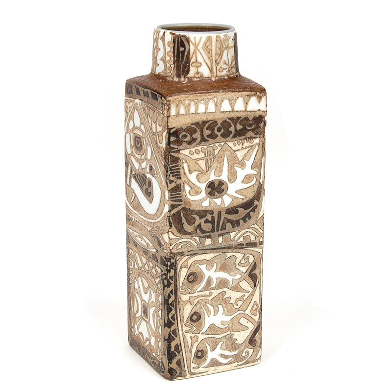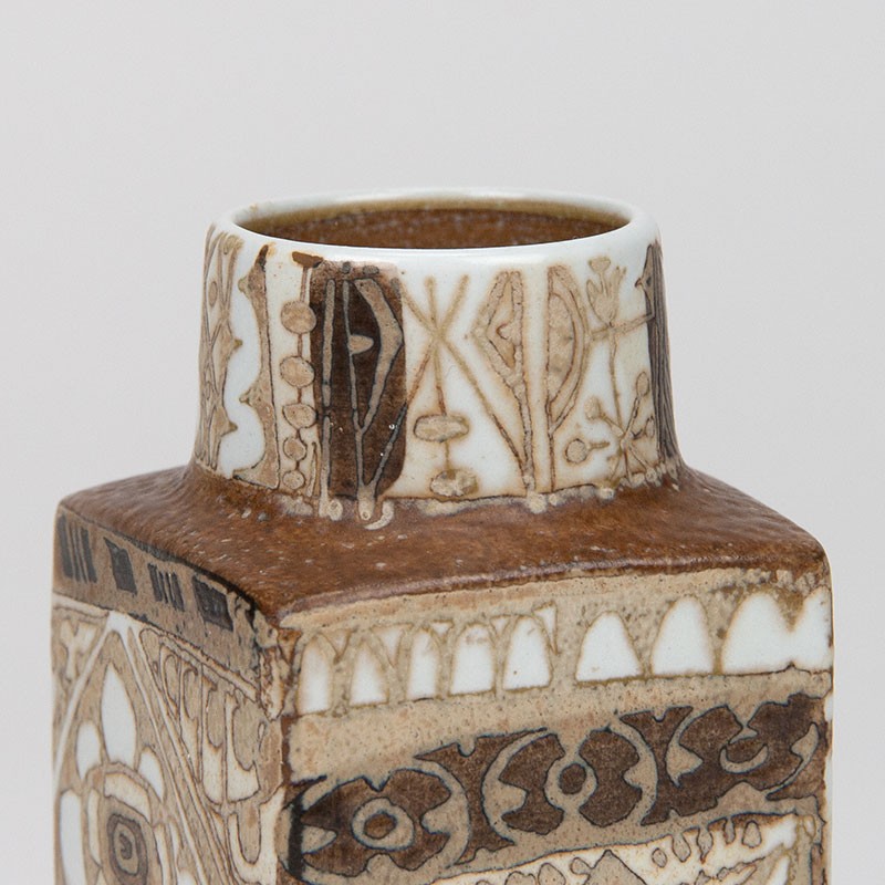 Royal Copenhagen ceramic vase designed by Nils Thorsson in the period 1969-1974. The vintage vase is numbered 719/3455 and is part of the Aluminia Baca series. The condition is good, undamaged, see details. The dimensions are 6 cm wide and long, height is 18.7 cm.