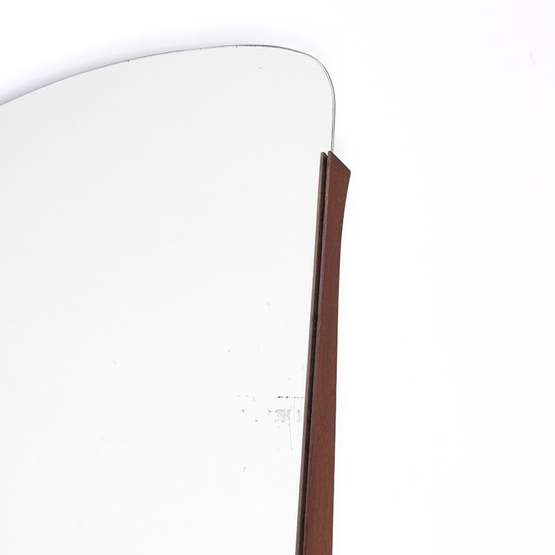Danish mirror from the late fifties. Beautiful asymmetrical model with a narrow shelf. The condition is reasonably good, some spots are visible in the mirror itself, see details. The price has been adjusted accordingly. The dimensions are 41.5 cm wide, 12 cm deep and 59 cm high.