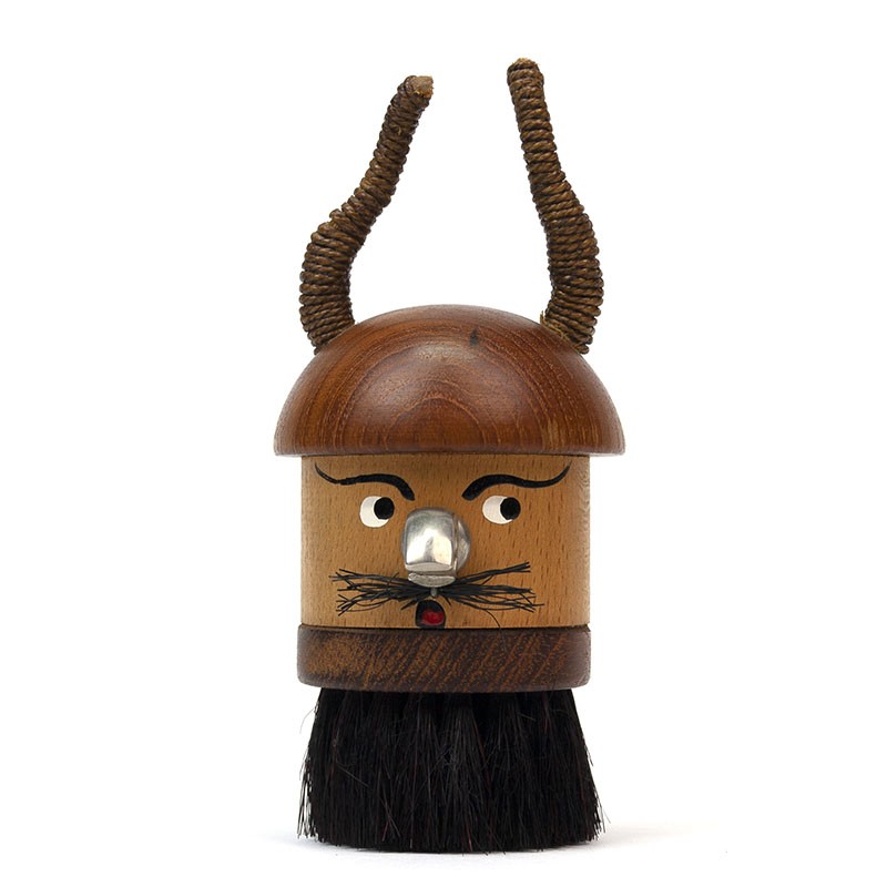 Sixties/seventies object from Scandinavia. The figure represents a Viking and can be used as an opener and table duster. The condition is good, see details. The dimensions are 9 cm high and 6 cm in diameter, the height including the horns is 13.5 cm.