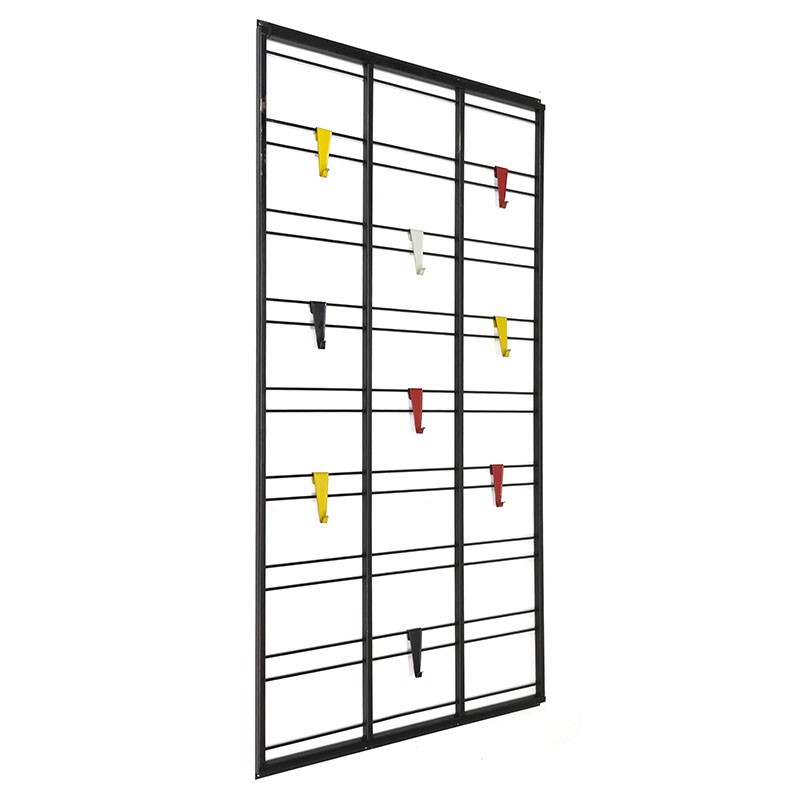 Dutch vintage design coat rack from the late fifties, early sixties. The coat rack was designed by Tjerk Reijenga for Pilastro and is called the toonladder in Dutch. Black metal frame with 9 colored hooks that can be placed yourself. The condition is fairly good, here and there some light oxidation on the black frame, see details. The dimensions are 76 cm wide and 150 cm high.