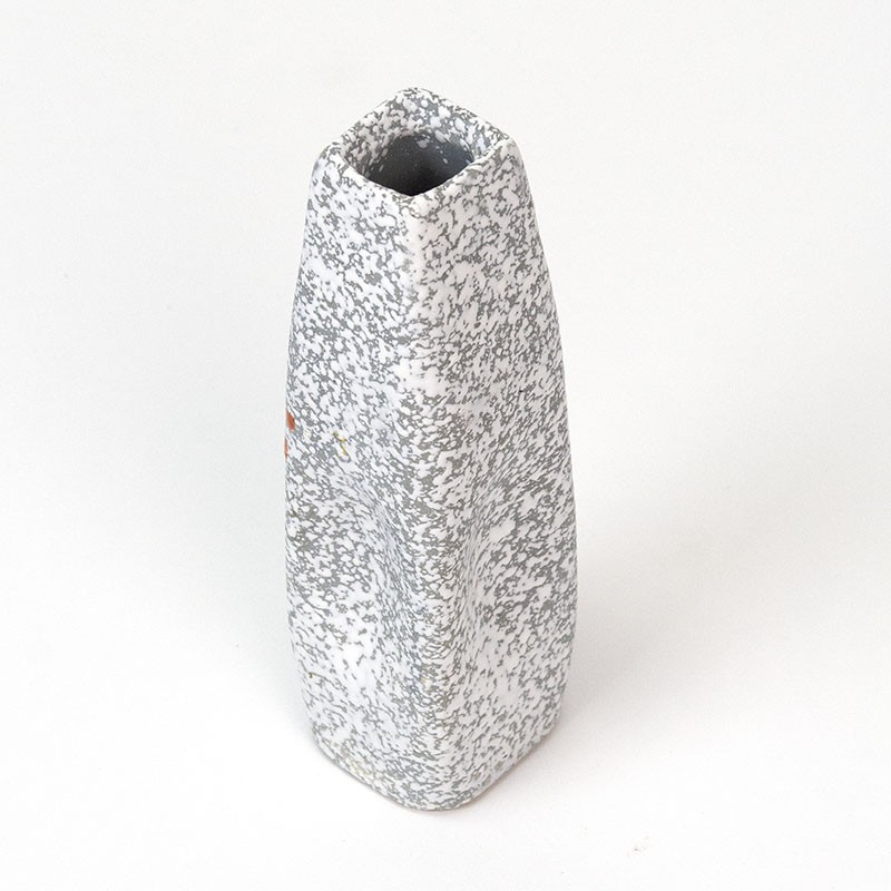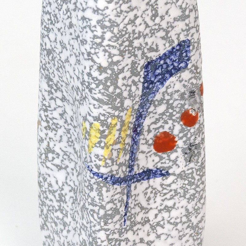 Earthenware vase from the fifties. Nicely decorated in primary colours. The condition is good, undamaged, see details. The dimensions are 5.5 cm wide and 19 cm high.