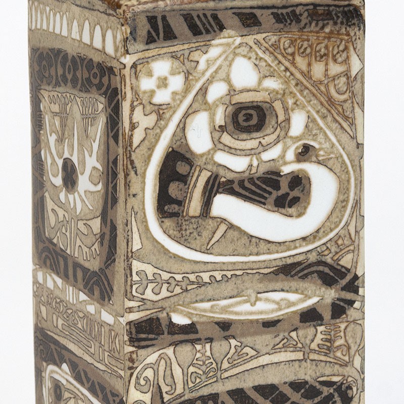 Danish ceramic vase designed by Nils Thorsson for Royal Copenhagen in the period 1969-1974. The vintage vase has number 719/3259 and is part of the Aluminia Baca series. The condition is good, undamaged, see details. The dimensions are 7.5 cm wide and long, the height is 22.5 cm.