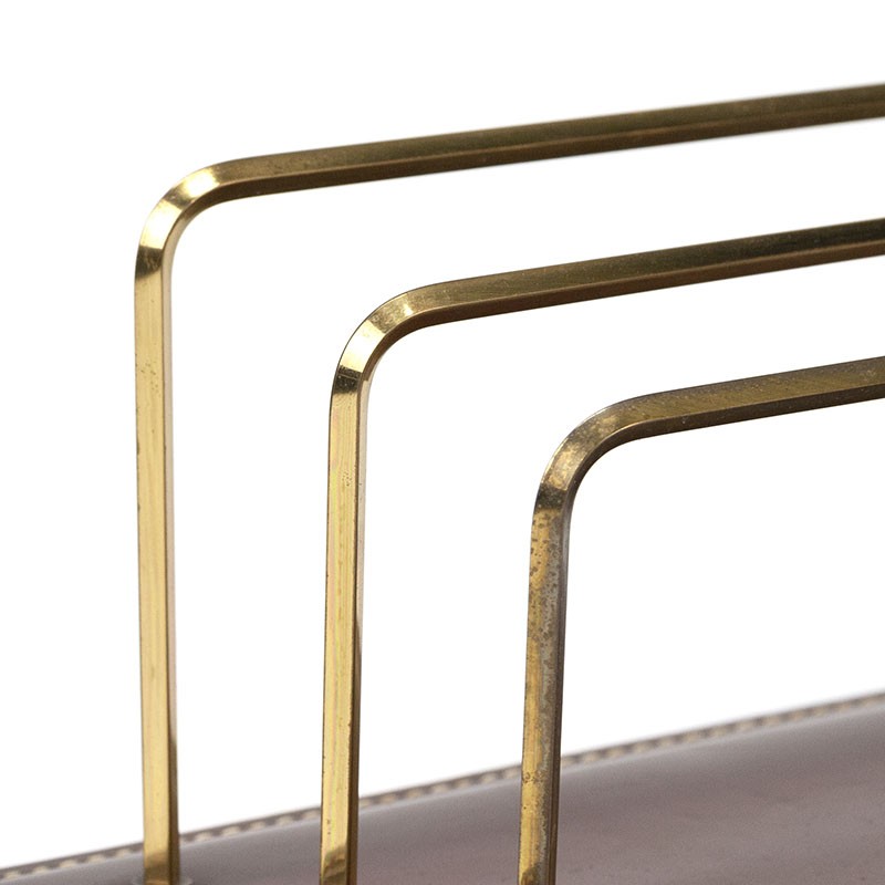 Letter holder with brown leather base and brass colored brackets, vintage item. The design of the letter holder has been attributed to Jacques Adnet, a French designer of the 1950s. The condition is good considering the age, see details. The dimensions are 24 cm long, 14 cm deep and 11 cm high.