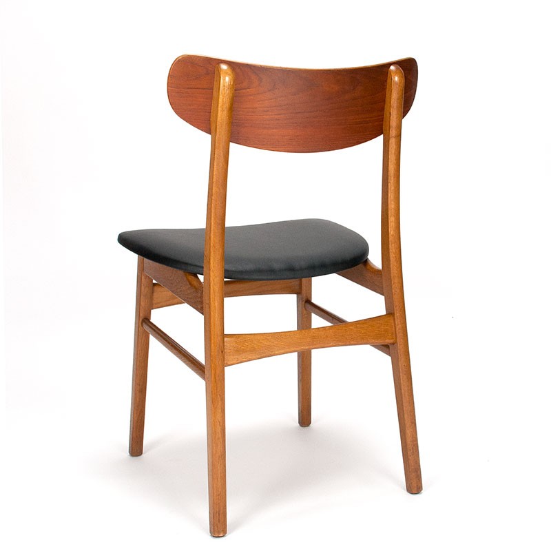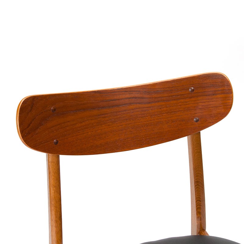Dining table chair, vintage Danish model from the sixties. The chair has a teak backrest and oak frame. The seat is covered with black imitation leather. The condition is good, minimal traces of use, see details. The dimensions are 46.5 cm wide, 47 cm seat height and 76.5 cm high.
