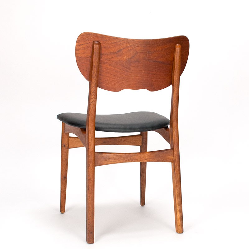 Danish vintage dining table chair with special design backrest. The backrest is made of teak, the frame is oak. Beautiful vintage model from the sixties. The condition is good, minimal traces of use (seat renewed), see details. The dimensions are 47 cm wide, 47 cm seat height and 79 cm high.