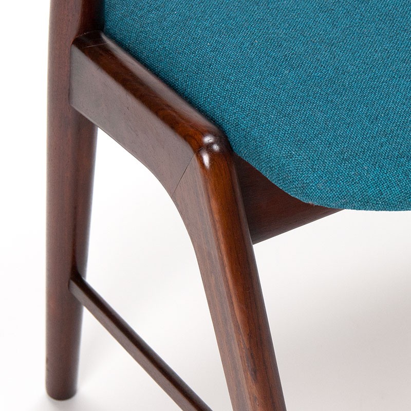 Mid-Century Modern Danish design chair, made of rosewood, from the mid-1960s by Korup Stolefabrik. The design of the chair, model 32, is attributed to Kai Kristiansen. It's a beautiful, stylish design with a small armrest and a lovely rounded backrest. The condition is good, with minimal signs of wear consistent with its age; see details. The dimensions are 54 cm wide, 46 cm seat height, and 75.5 cm high.