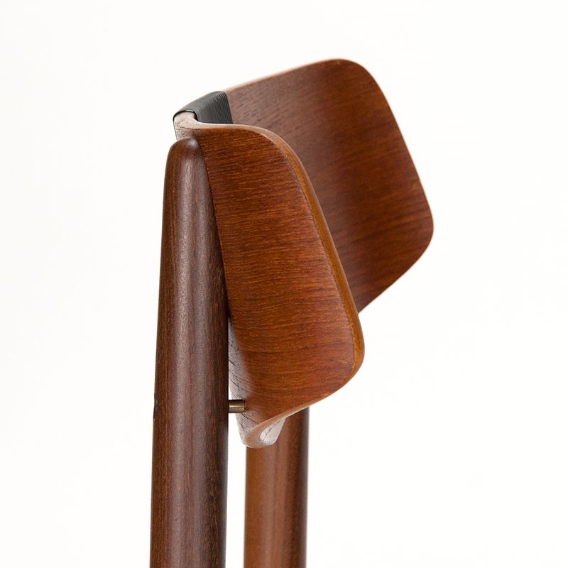 Vintage dining chair from the late 1950s. Made in Denmark with a beautifully designed backrest. A special detail is the wrapped handle. It is in good condition; the upholstery has been replaced with black faux leather. The dimensions are 46 cm wide, 45.5 cm seat height, and 77.5 cm high.