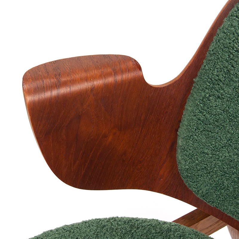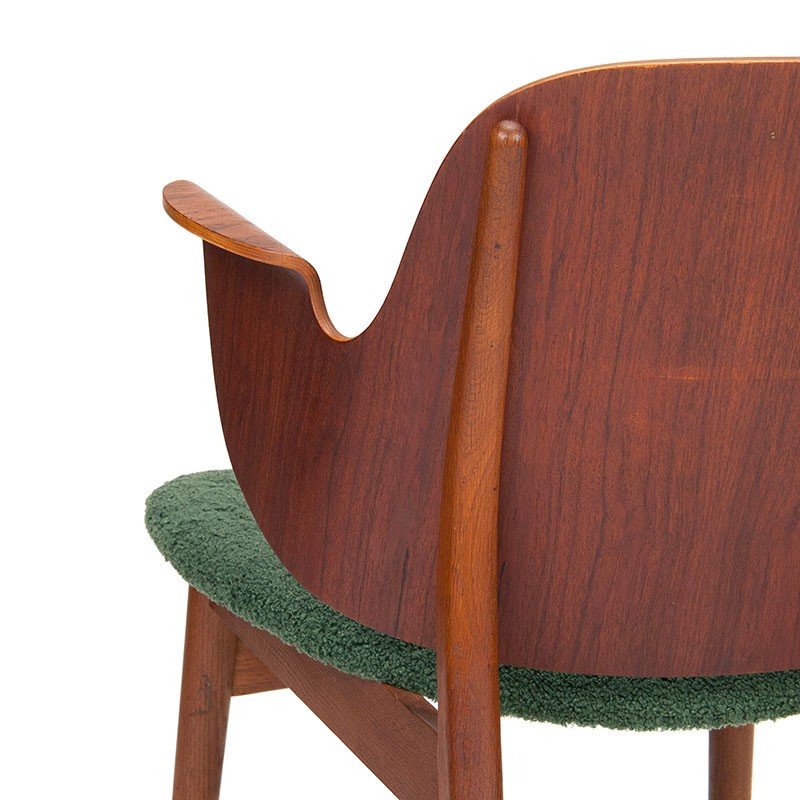 Mid-century teak designer armchair, model 107, 1957. A beautiful design by Danish designer Hans Olsen and produced by the Bramin furniture factory. This vintage chair has a teak backrest and an oak frame. It is in good condition with minimal signs of wear, see details. The dimensions are 60 cm wide, 42.5 cm seat height, and 73.5 cm high.