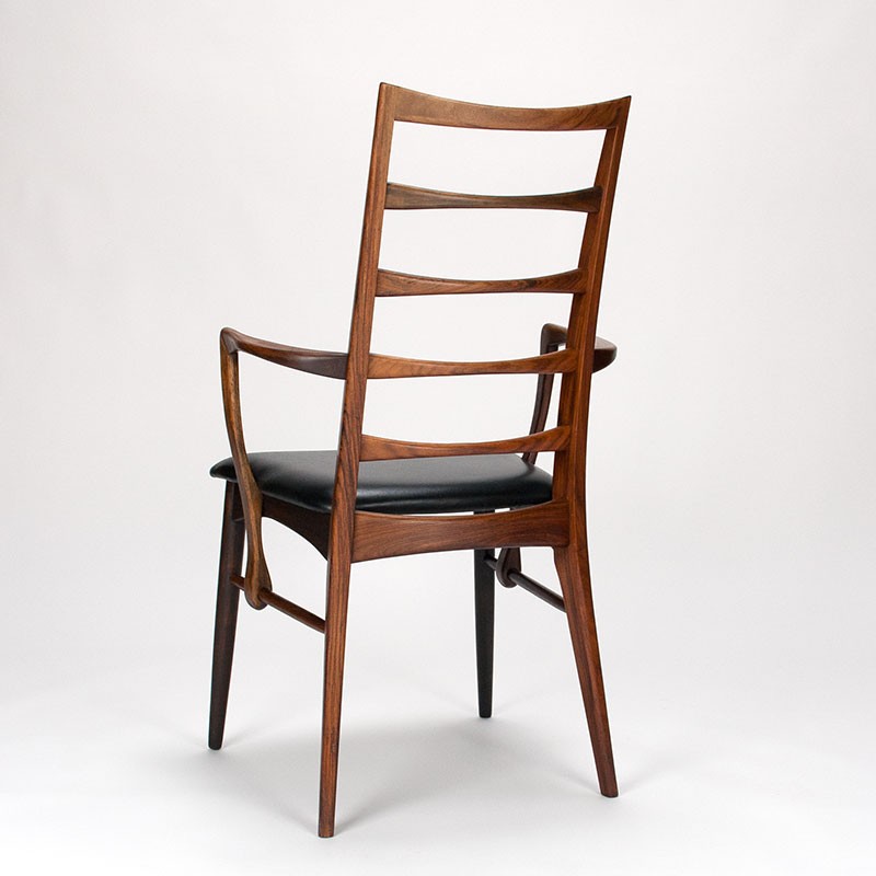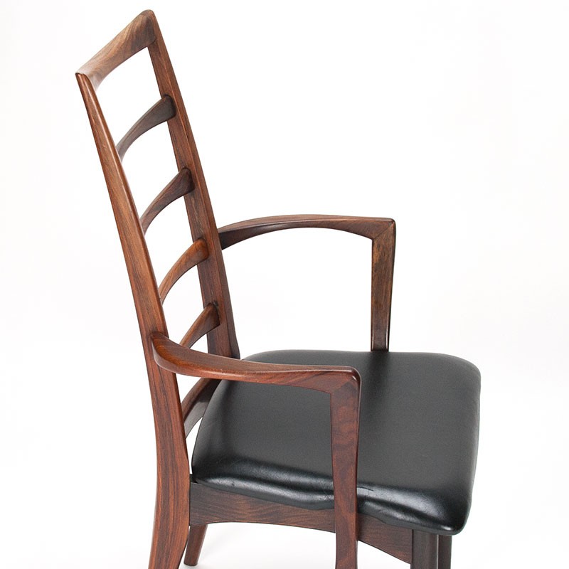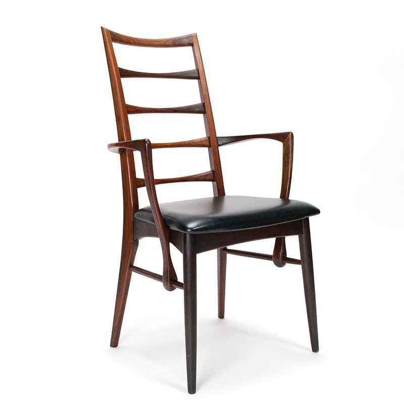 Set of two Danish design chairs with armrests in rosewood. These Mid-Century Modern vintage chairs were designed by Niels Kofoed with the name Lis and produced by Hornslet Møbelfabrik. These beautiful, stylish designer chairs are of very high quality. The chairs are originally upholstered in black leather. They are in good condition, with only minimal signs of wear, see details. The dimensions are 56 cm wide, 46 cm seat height, and 93 cm high.