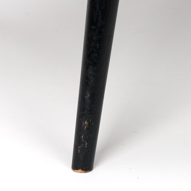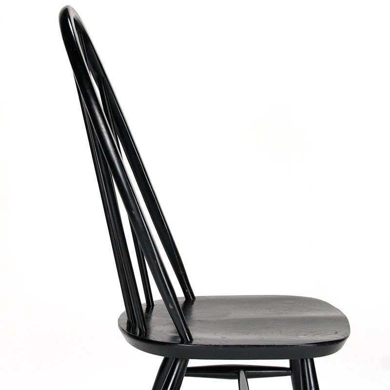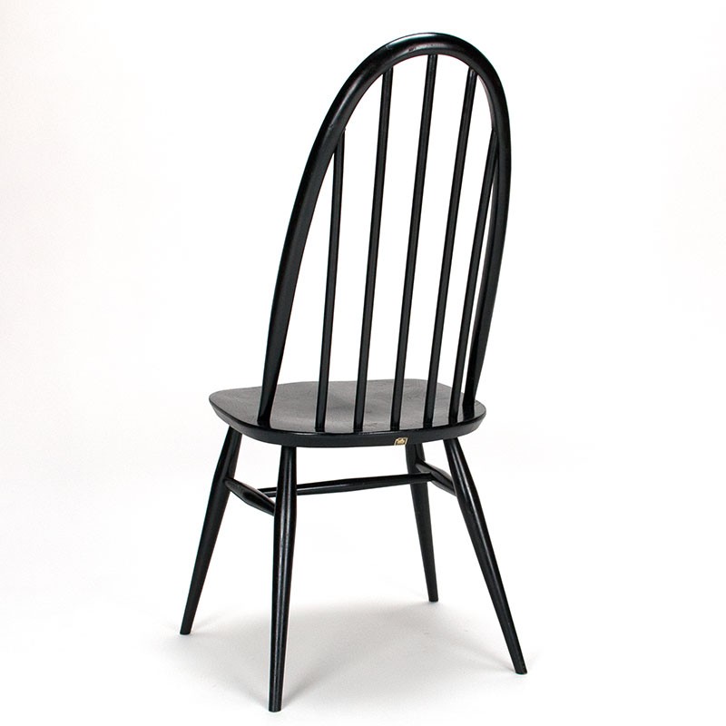 English Mid-Century design chair from the 1950s. Quaker model, designed by Lucian Ercolani, marked on the bottom and back. Original black finish. The condition is good, with minor signs of wear consistent with age; see details. The dimensions are 42.5 cm wide, 42.5 cm seat height, and 96 cm high.
