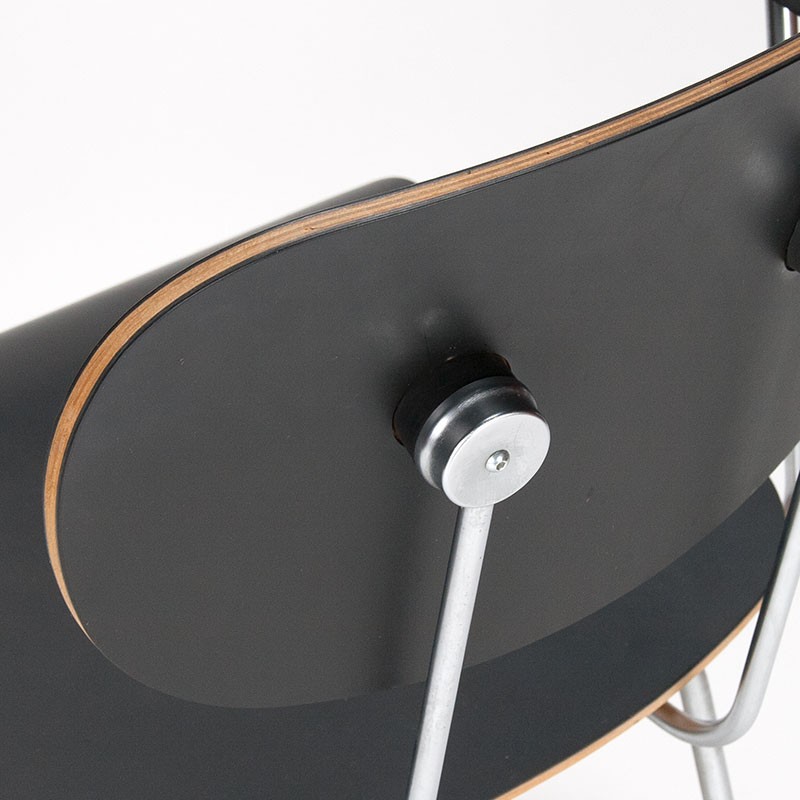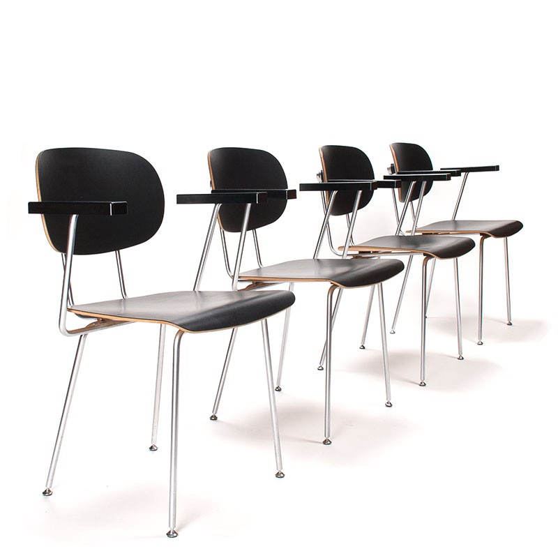 Set of 4 model 216 dining chairs designed by Wim Rietveld for Gispen in 1953. This set is a Dutch Originals edition (marked). Beautiful chairs with metal frames, black stained seats, and Bakelite armrests. The condition is good, although there are some scratches on the seats. The dimensions are 59 cm wide, 46.5 cm seat height, and 80.5 cm high.
