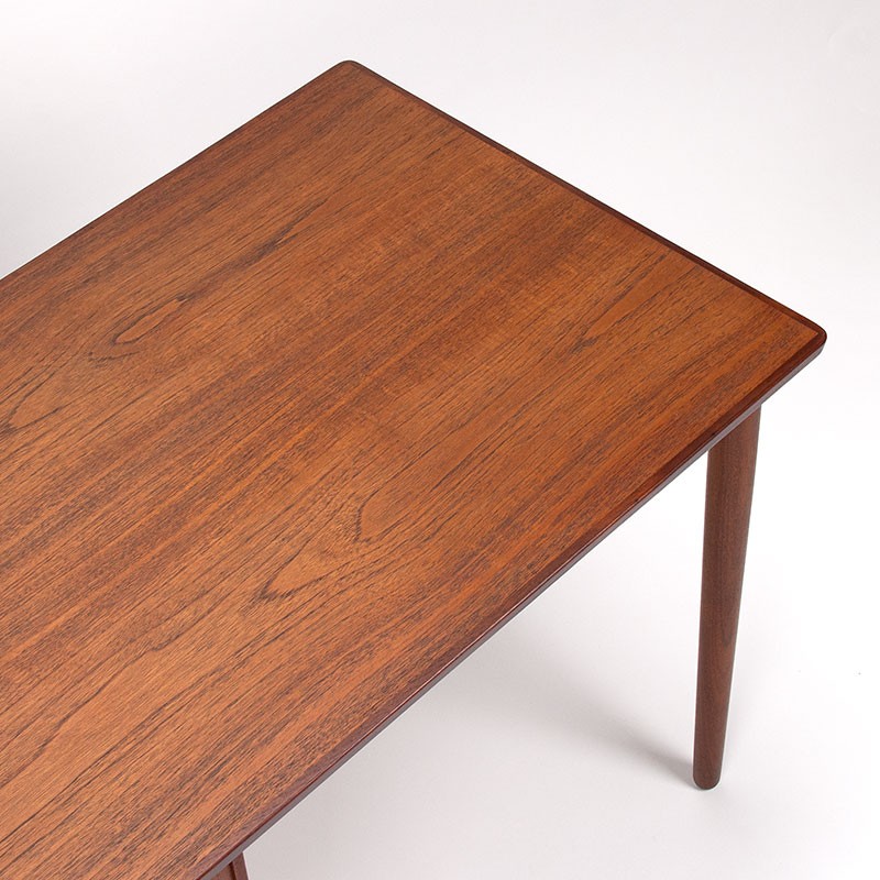 Danish design desk, branded with a Vamo Sønderborg Møbelfabrik brand mark. Vintage teak desk with a folding worktop, which quickly creates a spacious desk. The design is attributed to Arne Vodder. The drawer unit can be slid and positioned on either the left or right. Beautiful, high-quality desk. The condition is good, see details. The dimensions are 115 cm long (with an extension of 42 cm to a 157 cm worktop length), 64 cm deep, and 73 cm high.