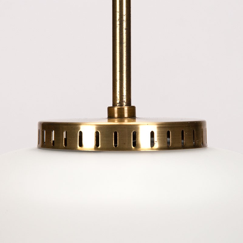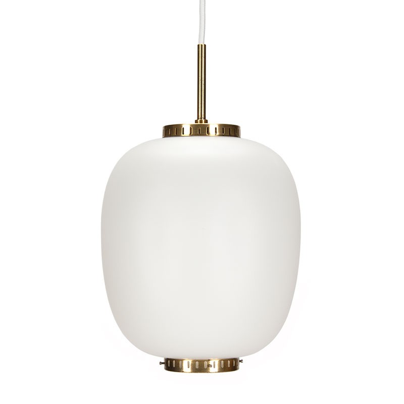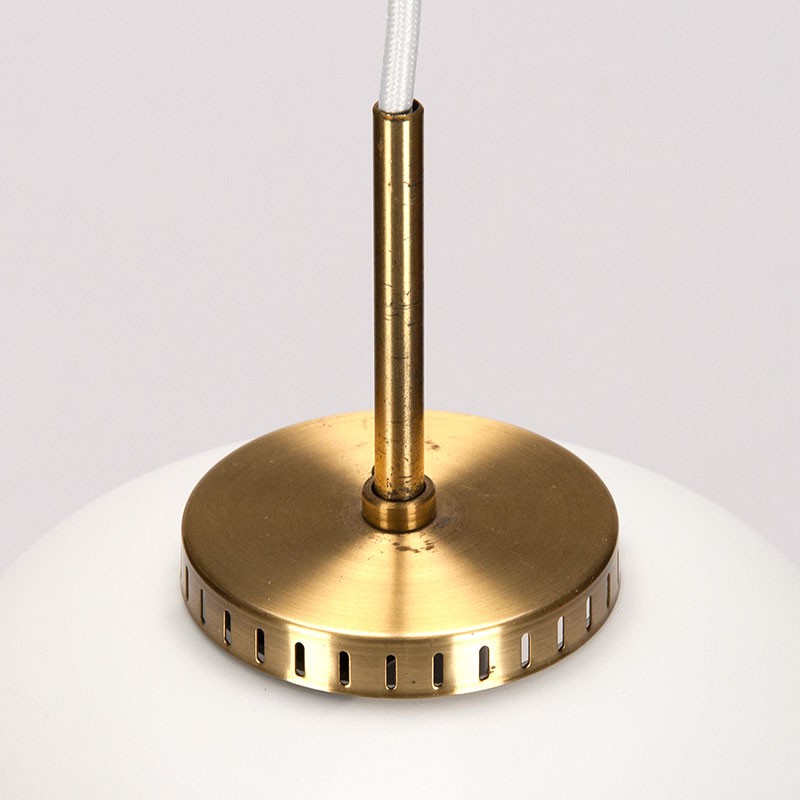 Danish Mid-Century design pendant lamp from the fifties. The vintage lamp, the Kina pendant, was designed by Bent Karlby. Made of white milk glass with brass details. Beautiful stylish lamp. The condition is good, wiring has been renewed, see details. The dimensions are 28 cm high (excl. brass pipe) and 22.5 cm in diameter.