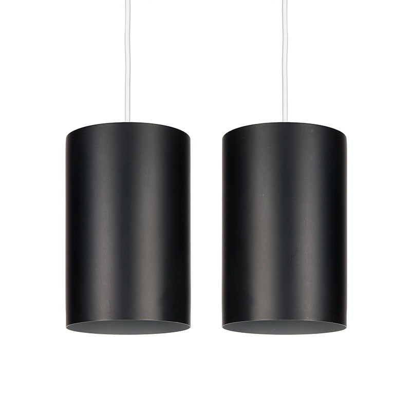 Set of 2 pendant lamps designed by Eila & John Meiling in 1967 for Louis Poulsen. Special detail is a gray edge on the inside, otherwise it is white on the inside. The lamps are marked, type 16512. The condition is good, very minimal traces of use and rewired, see details. The dimensions are 14.5 cm in diameter and 21.5 cm high.