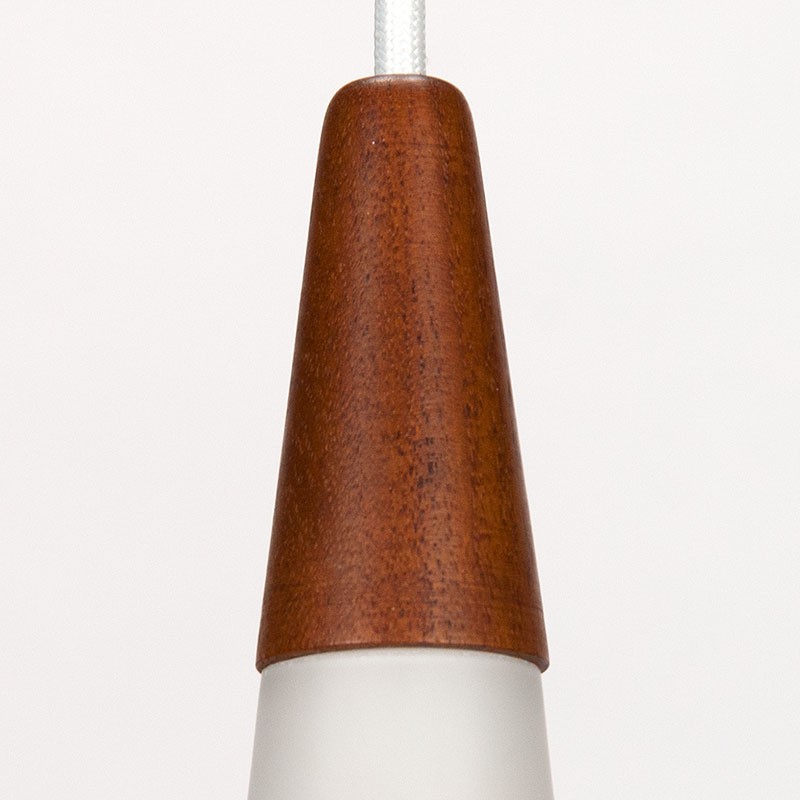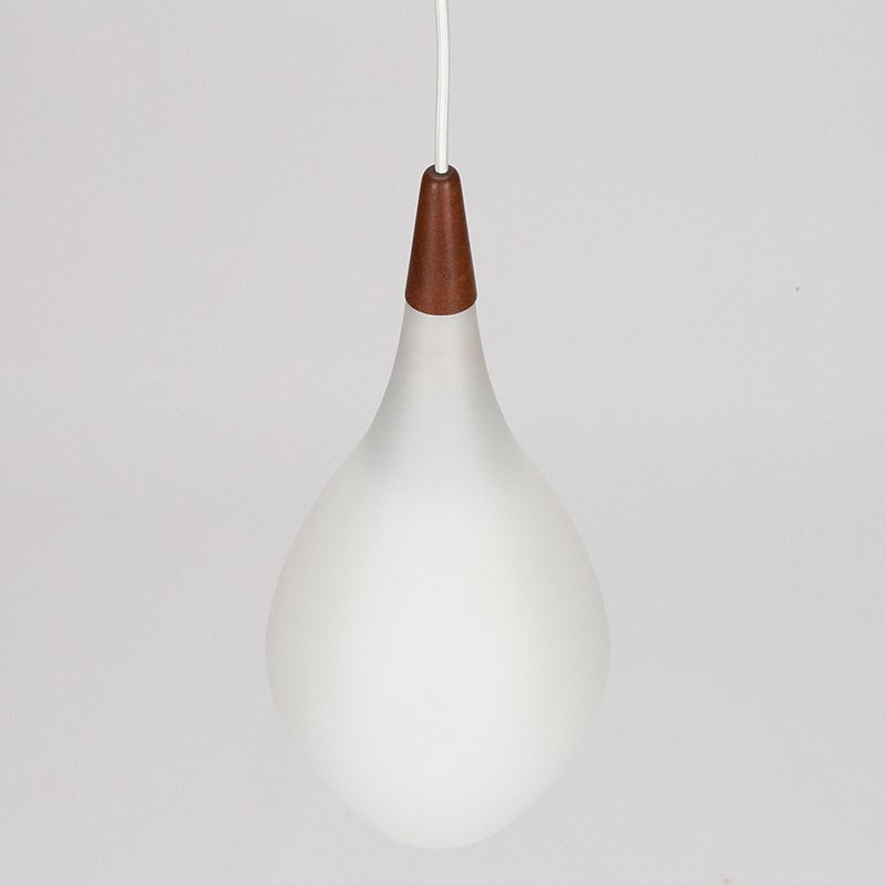 Danish vintage design pendant lamp from the sixties. The pendant lamp is made by Holmegaard. The color is white, opaline glass, with a teak top. The name of the lamp is the drop. The condition is good, undamaged and the wiring has been checked, see details. The dimensions are 43 cm high and 18 cm in diameter.
