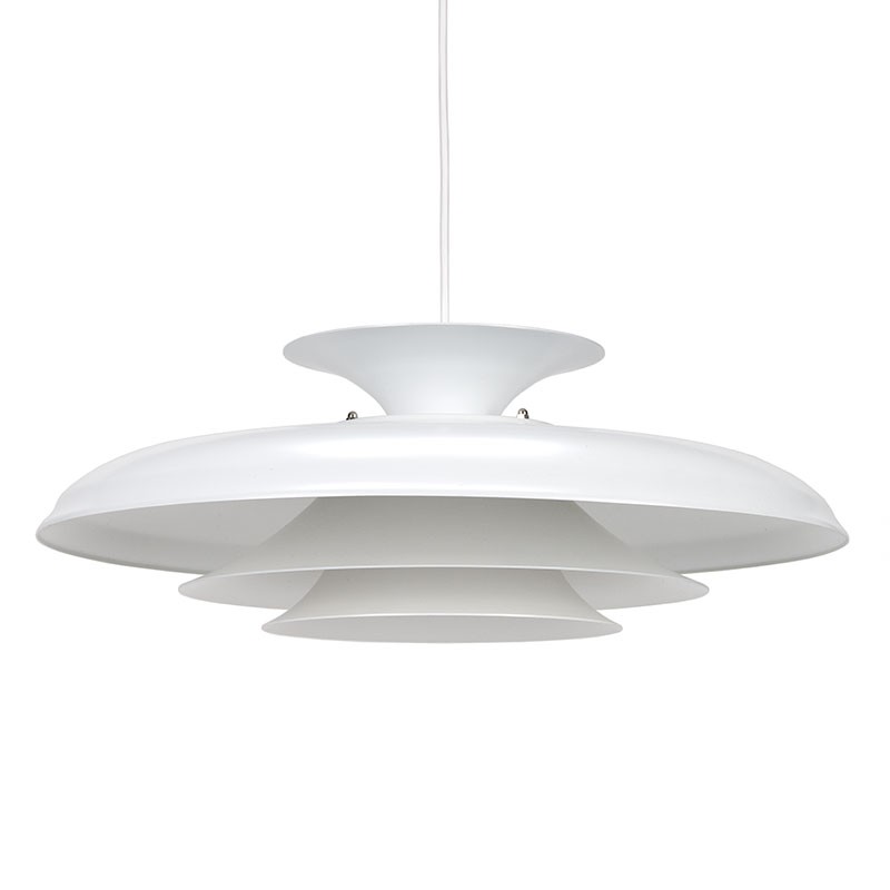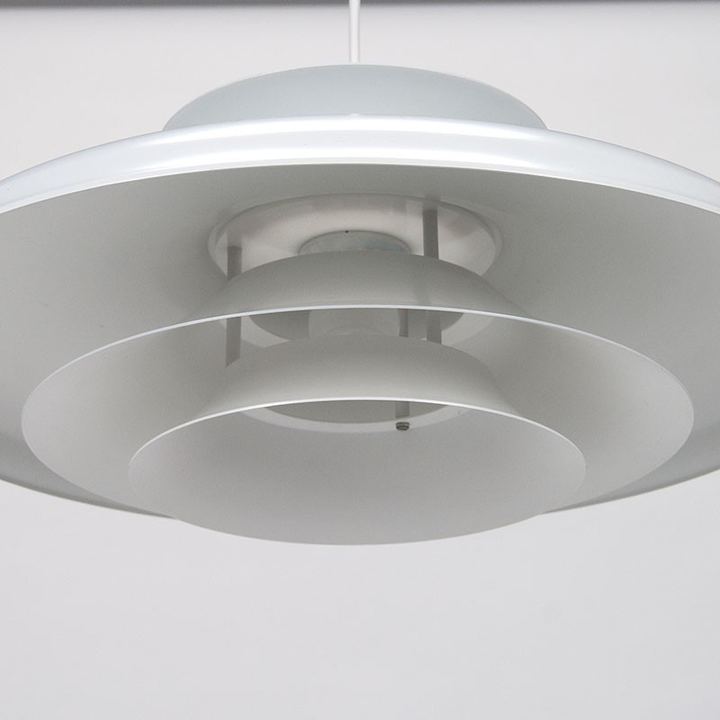 White pendant lamp from Denmark. This vintage lamp is constructed from several metal discs. The design is inspired by Poul Henningsen's models. It is in good condition; the wiring has been replaced, see details. It measures 50 cm in diameter and 17.5 cm high.