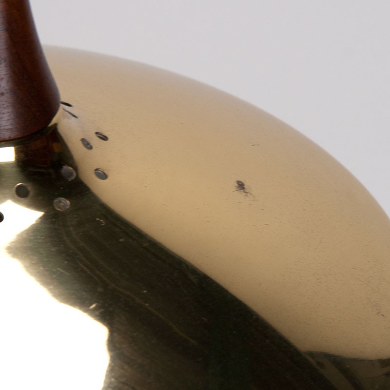 Swedish pendant lamp from 1960-1969. High-quality vintage pendant lamp. Made of thick brass-colored metal with a rosewood detail at the top and diffuser. This unique pendant lamp is marked Fagerhults. The condition is good considering its age, with only minor oxidation spots on the brass (not bothersome). The diffuser is somewhat stained, see details. The dimensions are 32 cm in diameter and 28 cm high.