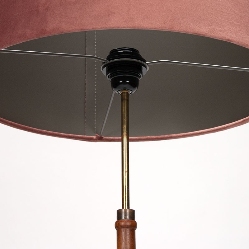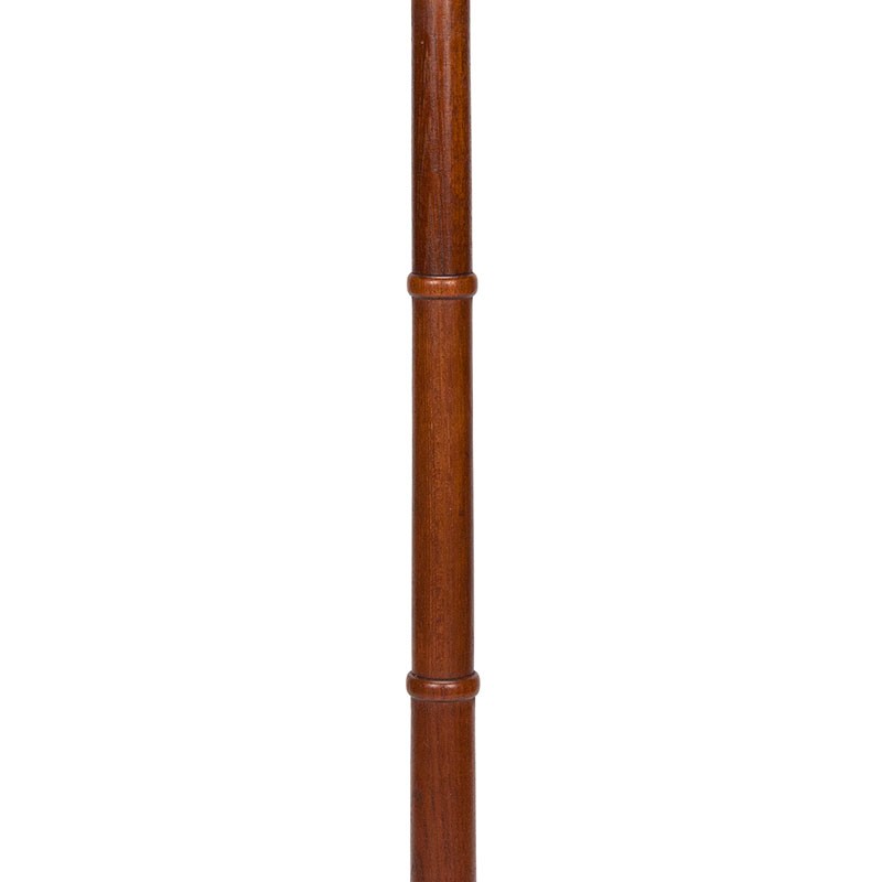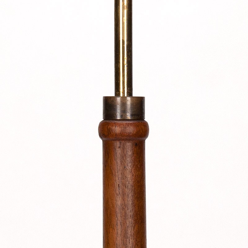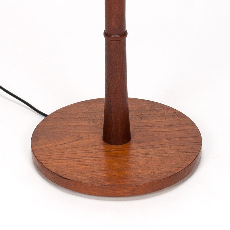 Floor lamp from the period 1960-1969, Denmark. Beautifully designed base in teak with small brass detail. The lamp is adjustable in height. The condition is good, wiring replaced, see details. The dimensions are minimum 137 and maximum 167 high, the hood is 40 cm in diameter.