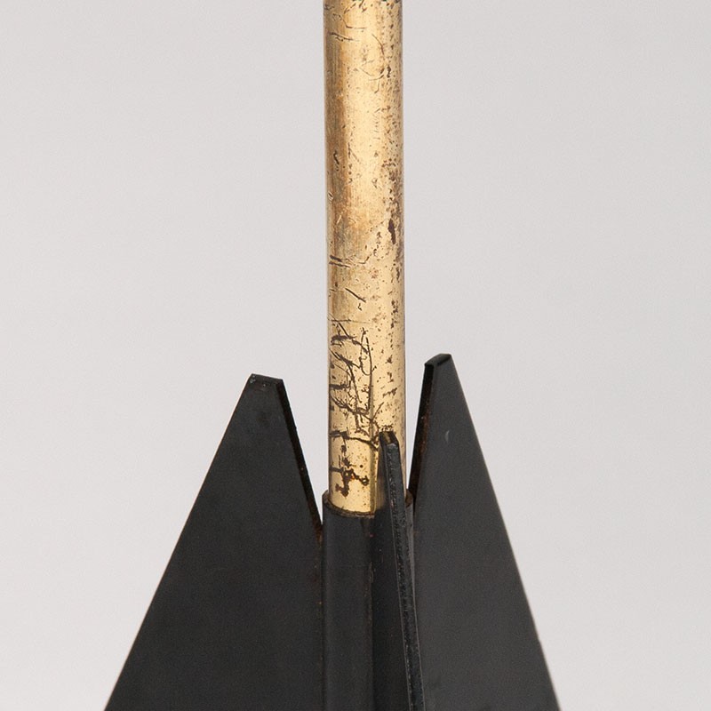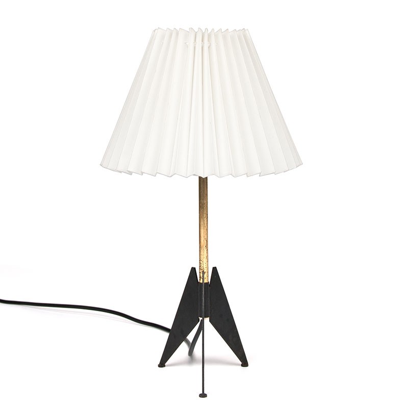Vintage table lamp from 1950-1959, Denmark. Beautifully designed base in black metal combined with brass. The shade is a pleated shade that clamps onto the bulb. The condition is good considering its age, with some signs of wear visible on the brass. The dimensions are 37.5 cm high, the shade diameter is 21 cm, and the base is 11 cm in diameter.
