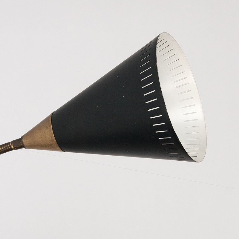 Mid-Century vintage wall lamp from the 1950s, Denmark. The design is attributed to Bent Karlby for Lyfa. Beautiful model with a swiveling, flexible brass arm. The condition is good, wiring has been replaced. The dimensions are a maximum of 65 cm long; the shade is 15 cm in diameter and 21 cm long.