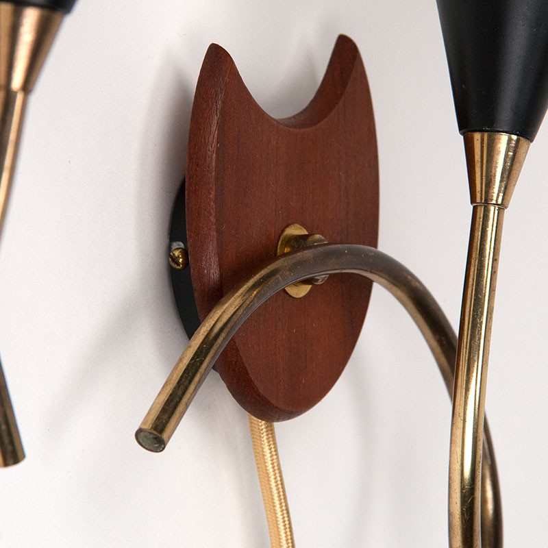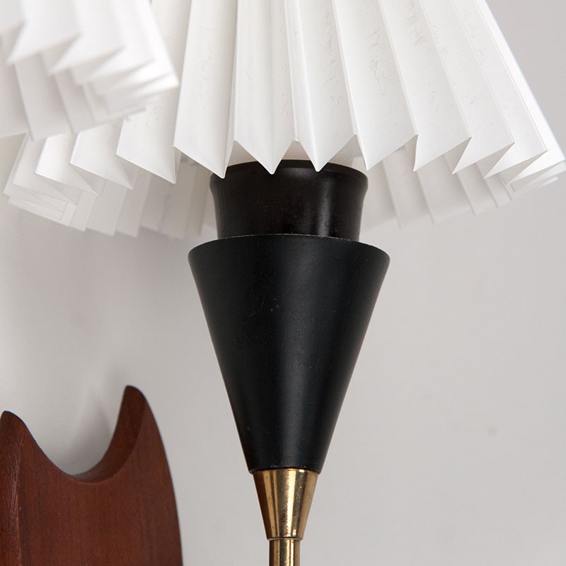 Danish wall lamps from the period 1955-1965. Beautiful vintage set with a fixture in teak, brass and black metal, both with a single white clip-on pleated shade. The condition is good, see details. The dimensions are 15 cm wide, 10 cm deep and 27.5 cm high (shade 15 cm in diameter).