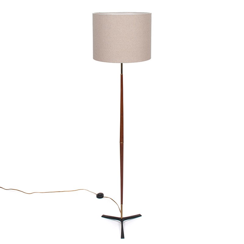 Stylish vintage floor lamp from the late 1950s, Denmark. The slender base, made of teak and brass, rests on a black cast iron tripod. The shade has been replaced with a new one. It is in good condition, see details. It measures 156.5 cm high and 40 cm in diameter.